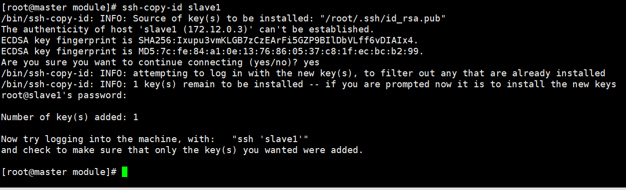 然后通过以下命令配置免密登录(slave1 为主机名或 IP):