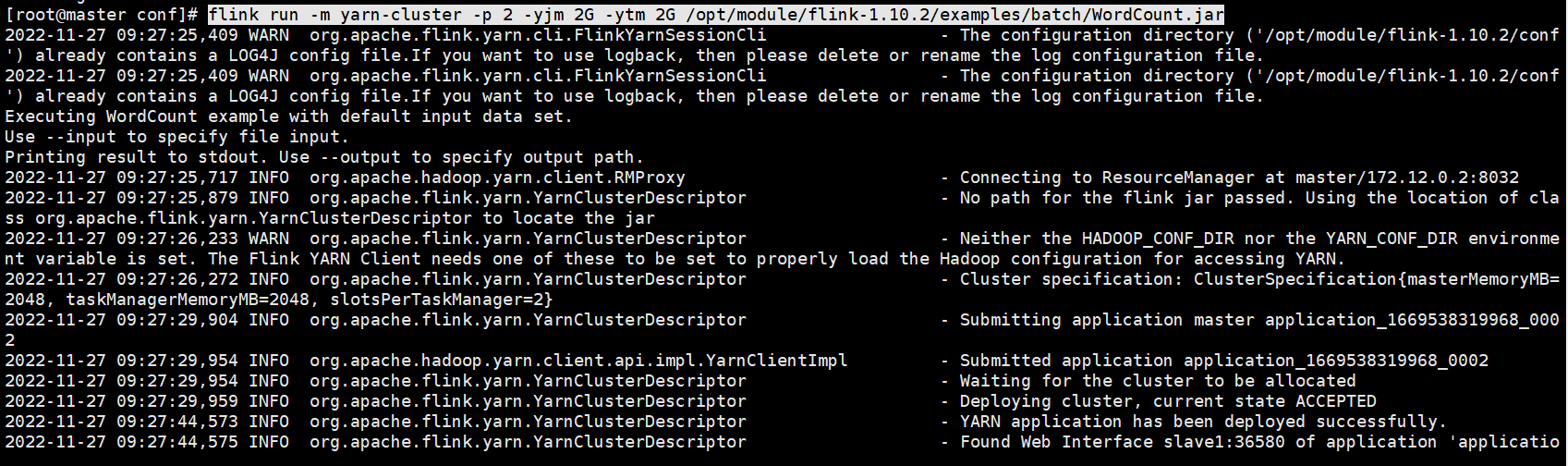 flink run -m yarn-cluster -p 2 -yjm 2G -ytm 2G $FLINK_HOME/examples/batch/WordCount.jar