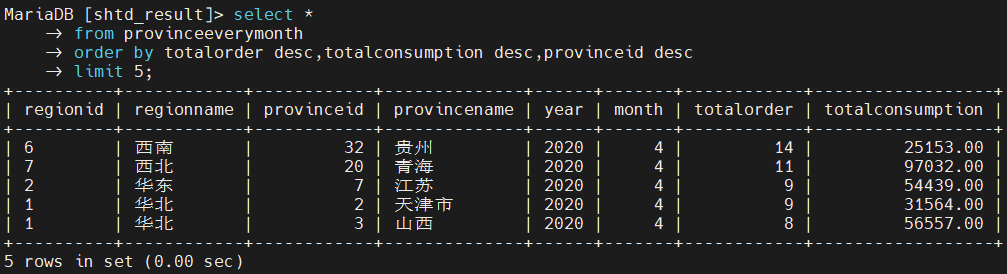 按“省份主键降序 + 平均金额降序”排序查询前 5 条记录,并将截图附入报告