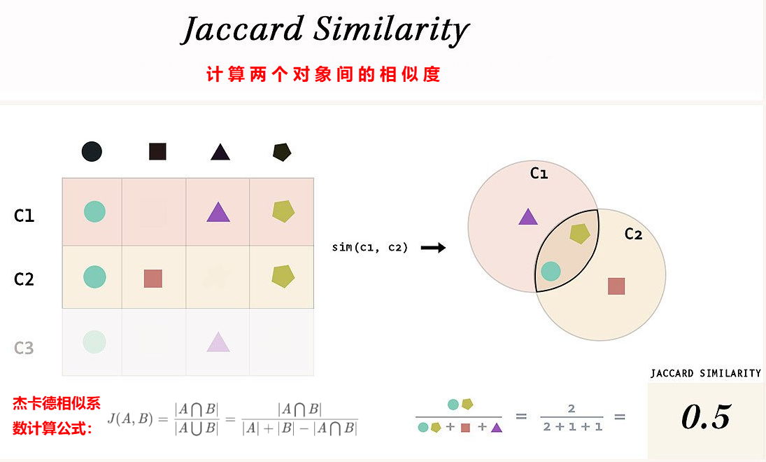 Jaccard 相似度用于衡量两个集合的相似程度,其计算公式如下: