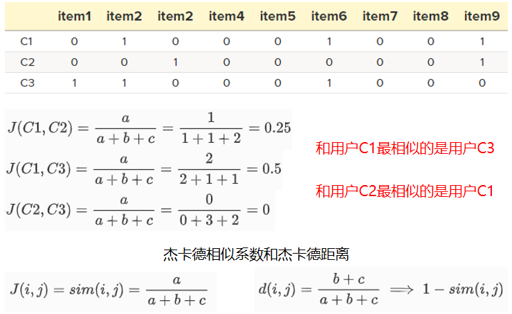 例如,有三个用户C1、C2和C3,他们购买的所有物品构成的物品集合为(item1、item2、…、item9)。由此构成的”用户-物品”交易表,以及三个客户每对之间的相似度可以用Jaccard系数来计算,如下图所示:
