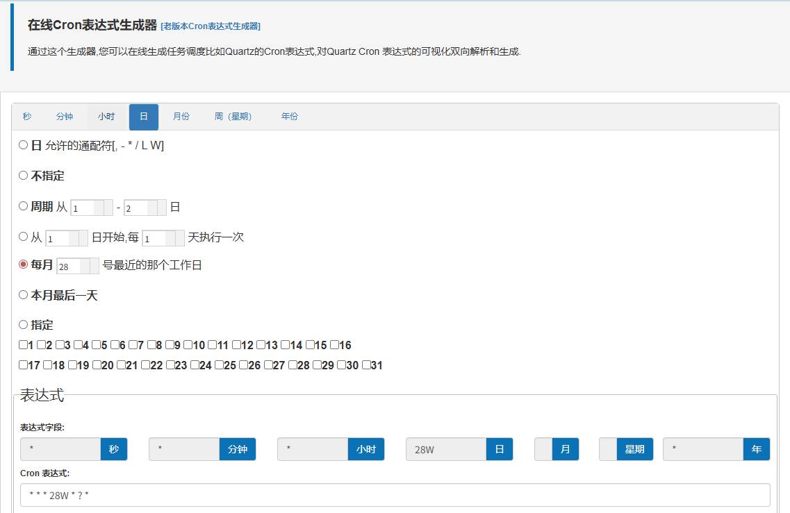 例:每月28号最近的工作日 → 如果28号是周六,则触发27号;如果是周日,则触发29号。