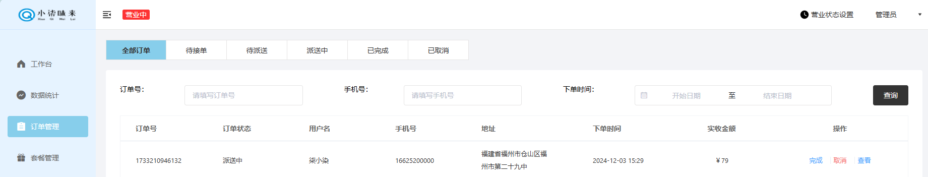 - 每天凌晨 1 点检查是否有“派送中”订单,若有则自动完成