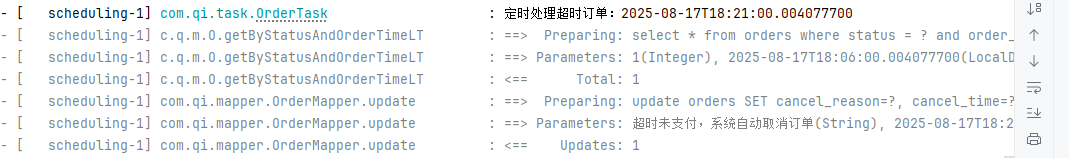 “派送中”订单处理方式类似,可通过修改cron表达式加快任务频率进行测试。
