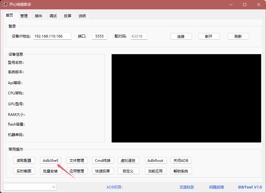 对于从安卓 4 升到 9 的老机型,安装软件可能会报错。可使用 开心电视助手 打开 ADB 命令行: