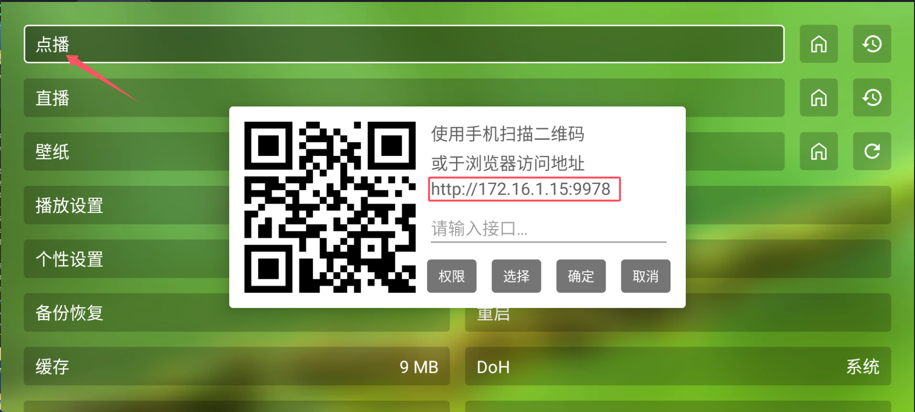 - 打开设置 → 选择点播 → 访问链接地址(与电视在同一网络下的设备)