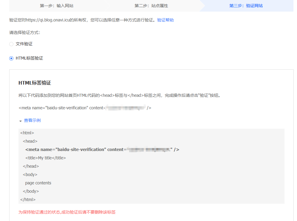 因为我不需要验证所有站点,只把博客收录了就行,所以这里我选的是网址前缀。输入站点的时候需要把http也带上