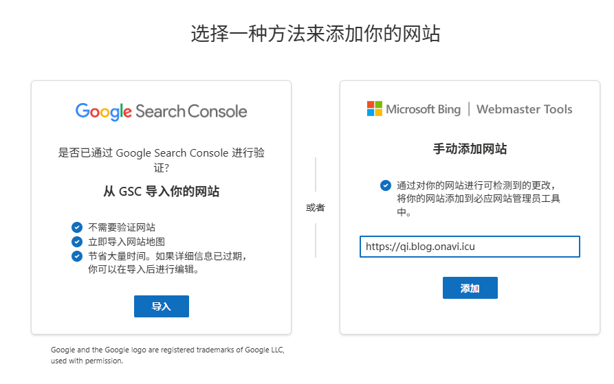 - 登录 Bing Webmaster Tools → 添加站点