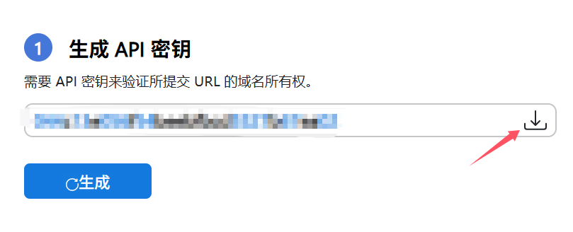 打开 Bing IndexNow,找到 API Key 点击下载箭头将文件下载到/source目录或主题的/source目录下并复制 API Key